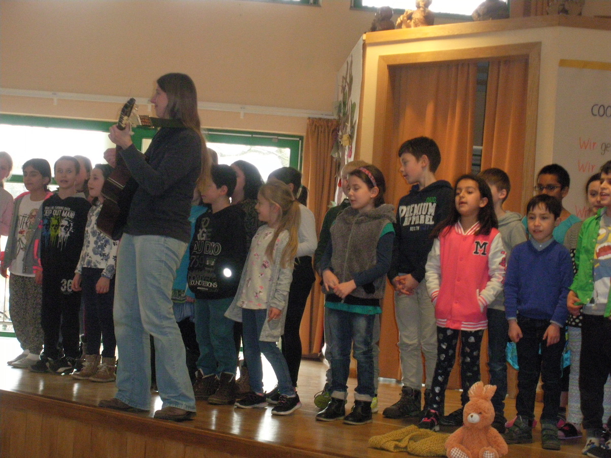 Am Freitag vor den Frühjahrsferien erlebten viele unserer Schulkinder etwas, was ihr Selbstbewusstsein sowie ihr Gemeinschaftserleben förderte: Sie sammelten Bühnenerfahrung und genossen die Vielseitigkeit der Musik beim alljährlichen Frühjahrssingen vor der Unterrichtspause. Und das mit großer Freude und Einsatz. So waren schon die ersten Sommerkleider und manch gebügeltes Oberhemd auf der Bühne zu sehen. Das abwechslungsreiche Programm weckte bei allen Sängern und Sängerinnen gleich wohl auch beim Publikum eine Freude an der Musik. So zeigten die Vorschüler den Zuhörern, wie sich ein Pizzicato anhört und danach war der schulberühmte „Lola-Rap“ der Klasse 1b genau die passende Musikrichtung, um den letzten schüchternen Musikhaderer zu begeistern. Als weiterer Höhepunkt folgte der erste Auftritt des frisch gegründeten Schulchores unter der Leitung von Frau Heere. „ Wir hatten nur drei Wochen Zeit, um zu proben, aber hören Sie selbst“, kommentierte Frau Heere mit einem strahlenden Lächeln. Und das Ergebnis hörte sich so gut an, dass Sänger und Publikum bei dem danach folgenden Abschlusslied:“ Ich lieb den Frühling…“ sich ohne Weiteres als Untergruppe der berühmten „Fischer-Chöre“ hätten bezeichnen können.