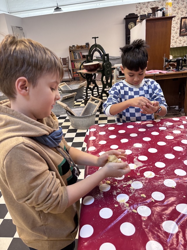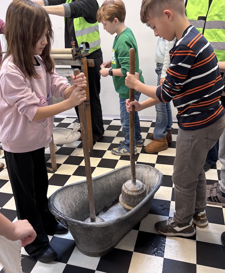 Anschließend durften die Kinder selbst aktiv werden. Sie wuschen Wäsche wie zu Urgroßmutters Zeiten – mit Waschbrett, Stampfer und Wringpresse. Danach ging es weiter: Kaffee mahlen, Teig kneten und schließlich Tagliatelle-Nudeln herstellen standen auf dem Programm.