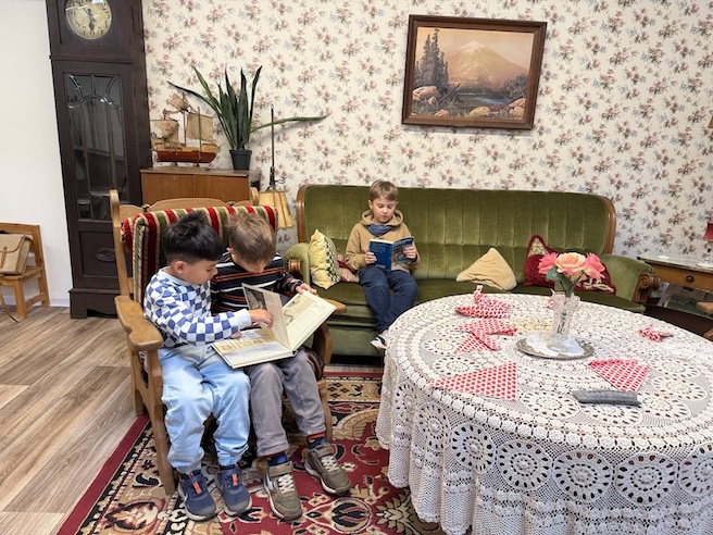 In der „guten Stube“ erfuhren die Schülerinnen und Schüler, wie ein Wohnzimmer früher eingerichtet war. Gemeinsam wurde überlegt, wie sich das Leben im Vergleich zu heute verändert hat und wie sehr moderne Geräte unseren Alltag erleichtern.
