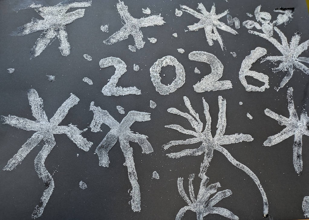 Zuerst wurde das Feuerwerk mit Kleister oder Flüssigkleber von den Kindern auf schwarze Pappe gemalt und anschließend mit Salz bestreut – ganz sorgfältig, damit das Salz auch wirklich auf dem Kleber hält.