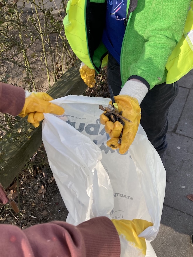 Schon vor Wochen hatte sich an unserer Grundschule Luruper Hauptstraße Frau Kliewer bei der Stadtreinigung um die bekannten, gelben Handschuhe und die Sammelbeutel gekümmert. Zeitgleich setzte unser Hausmeister Herr Mahrt zuverlässig den benötigten Bollerwagen wieder in Stand. Auch in diesem Jahr wollten sich die Kinder unsere Grundschule Luruper Hauptstraße an der Aktion „Hamburg räumt auf“beteiligen, um die Straßen ihres Stadtteils vom Müll zu befreien. Die Klasse 4b war in diesem Jahr das 4. Mal an der Räumaktion dabei, aber die Verwunderung war trotzdem nicht kleiner als in den Vorjahren. Die zahllosen, traurigen Zigarettenkippen waren wieder da und auch sonderbare Lager von Gassibeuteln hinter Stromkästen und viele geleerte, kleine Glasflaschen nahe eines Supermarktes erstaunten die Kinder und wurden dann einfach so behandelt, wie es eigentlich jeder Mensch tun könnte: Der Abfall landete in den Mülltüten. Im Nachgang der lebendigen Aktion tauchte die Frage auf: Wie wird es geschafft, dass Raucher ihre Zigarettenreste, Hundebesitzer in der Umgebung der Grundschule Luruper Hauptstraße ihre Gassibeutel und durstige Menschen ihre geleerten Flaschen einfach in den Mülleimer werfen? Die Konsequenzen hieraus konnten in den letzten Tagen dank des Einsatzes der Klasse4b in den letzten Tagen bestaunt werden: Saubere Ecken und Wegränder für ein schöneres Lurup. (BAP)